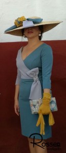 Junto a ella vino Maria del Mar, es una invitada de las que cuida hasta el último detalle para llevarse el titulo de «invitada perfecta». En el Photocall la podéis ver vestida de negro y rosa para una boda de hace unas semanas. Ha ella le gusta todo… flores, plumas, lazadas. Así que también fue muy fácil, la elección fue una pamela de paja grande con lazada con el mismo tejido que llevaba en el vestido y flores en azul y mostaza.