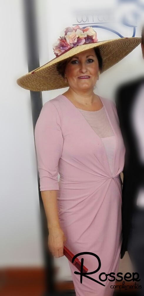 Esperamos que le entregaran su vestido para concertar nuestra cita y así poder elegir sus piezas sabiendo la certeza del color de éste. Tras mirar varias piezas decidió que la pamela de paja de tamaño grande sería la adecuada para su vestido. Una vez decidida la base, tocaba decidir la decoración ¿Plumas, lazada, pistilos…? Pues no, ninguna de estas fue la opción por la que se decantó Mercedes. Fue un enrejado de flores en tonos buganvilla, rosa fucsia, rosa palo y beige.