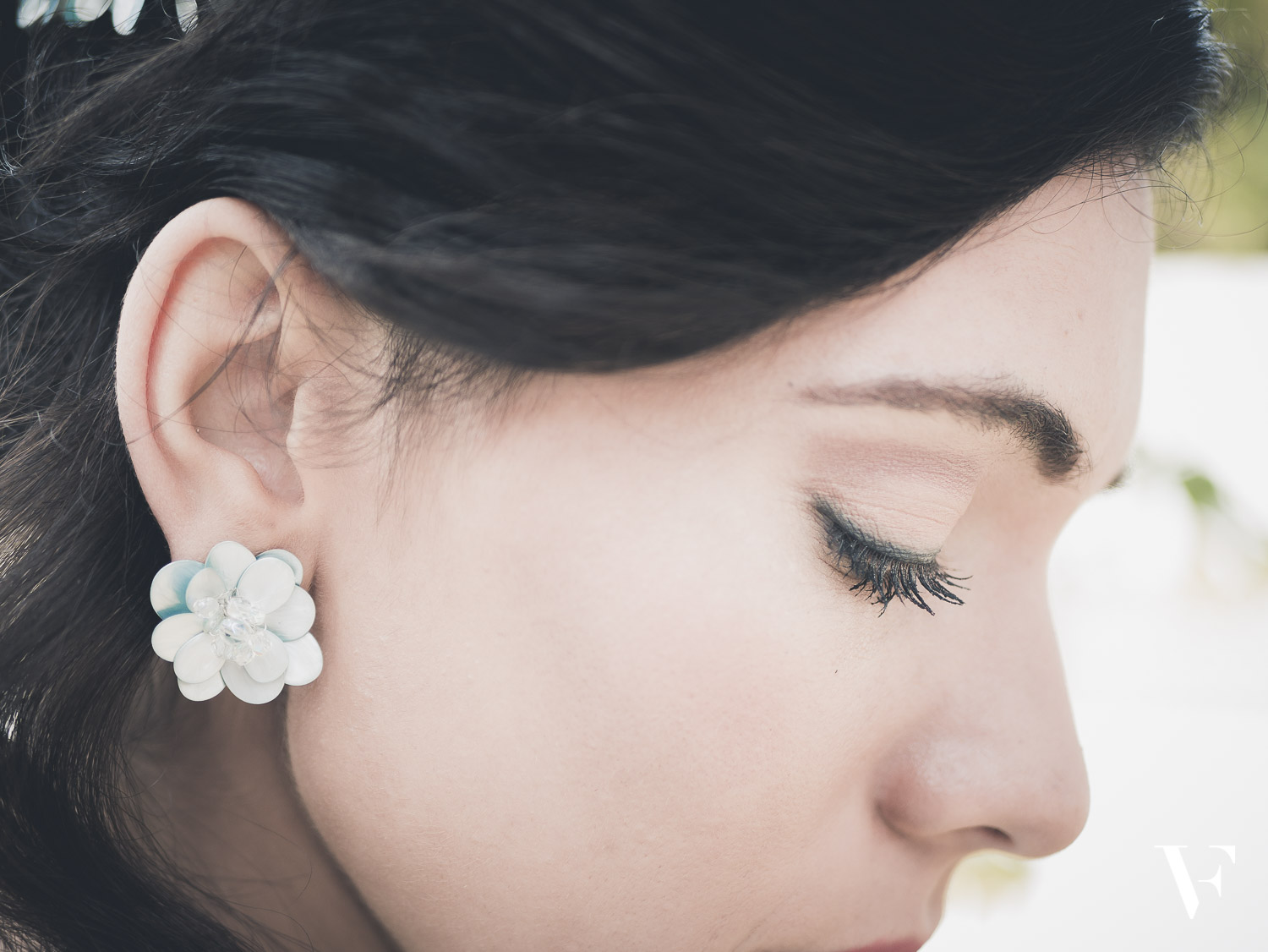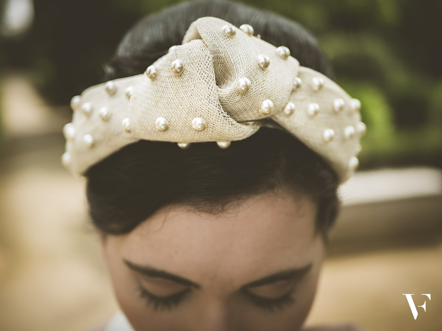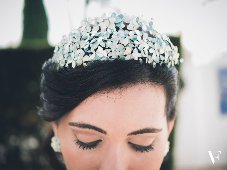 Y después de contaros que toque de magia fue dado por cada uno de mis compañeros, no hace falta que os diga que la mía fue la de realizar los complementos de la «novia». Para el primer vestido diseñé una corona esmaltada con cristales de swaroski y unos pendientes de hojas que hacían juego con la pedrería del traje. El segundo look, era mas arriesgado, así que vi muy oportuno una diadema de sinamay y seda con perlas, ya que tanto las diademas como las perlas son tendencias.