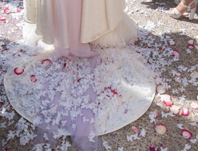 Como teníamos tiempo de sobra no paramos de idear. Pues… ¿por qué no aprovechar la ocasión y llevar un segundo tocado? Jugamos con que su traje de novia fue realizado por su diseñadora, de tal forma que se pudiera transformar para ir más cómoda. Ese sería el momento justo para llevar el segundo tocado de novia. En este caso se trataba de una diadema de tull realizado con parte de su velo degradado.